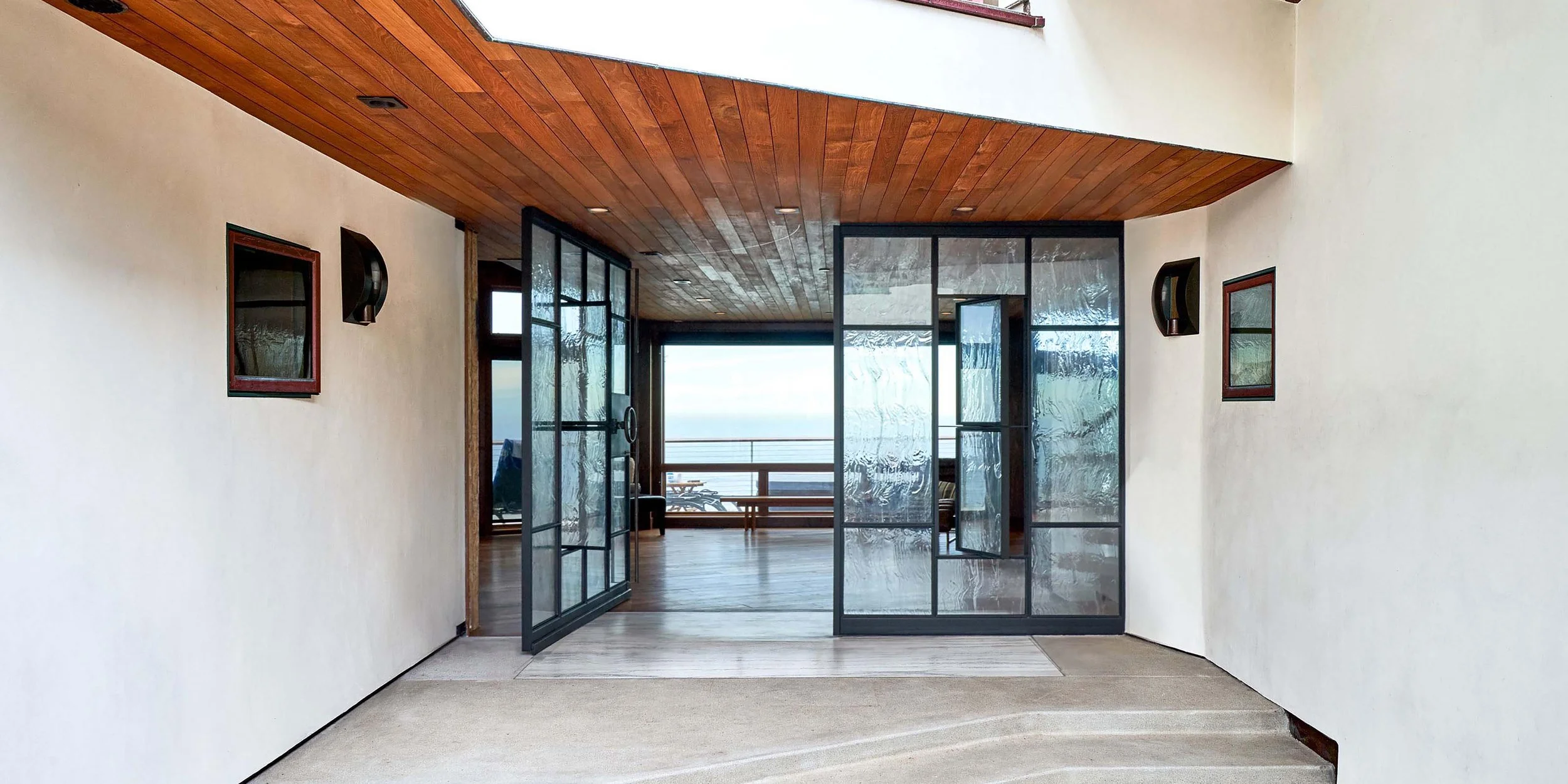This entry wall was designed and built for a client's San Diego beach front home. It boasts a steel frame, 4 operable windows, and an off-center pivot door. A feature element to this design is the wheel-operated gear system that locks and releases the door.